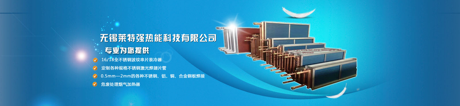 無(wú)錫萊特強(qiáng)熱能科技有限公司是專業(yè)生產(chǎn):銅鋁復(fù)合散熱器、鋼制散熱器、鋼鋁復(fù)合散熱器、(鋼鋁、銅鋁復(fù)合,鋼帶鋼管、不銹鋼、高頻、全銅軋制)等翅片管,空氣熱交換器,熱管換熱器,空氣冷卻器,螺旋板式換熱器,列管換熱器,冷凝器,煙氣加熱器、余熱回收、TSR盤(pán)管的公司。